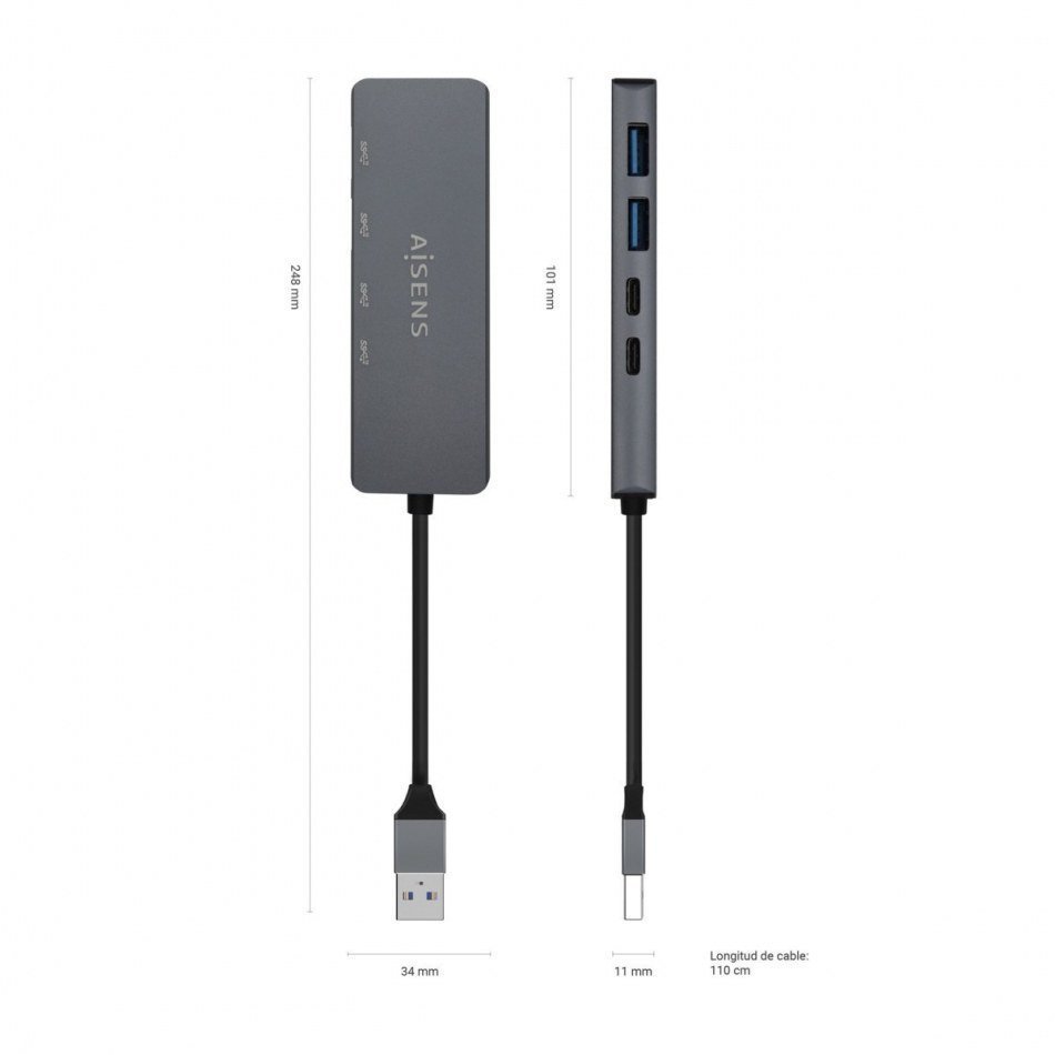 AISENS - HUB USB 3.2 GEN1 5G USB-A, USB-A/M-2xUSB-C/H-2xUSB-A/H, GRIS, 15CM