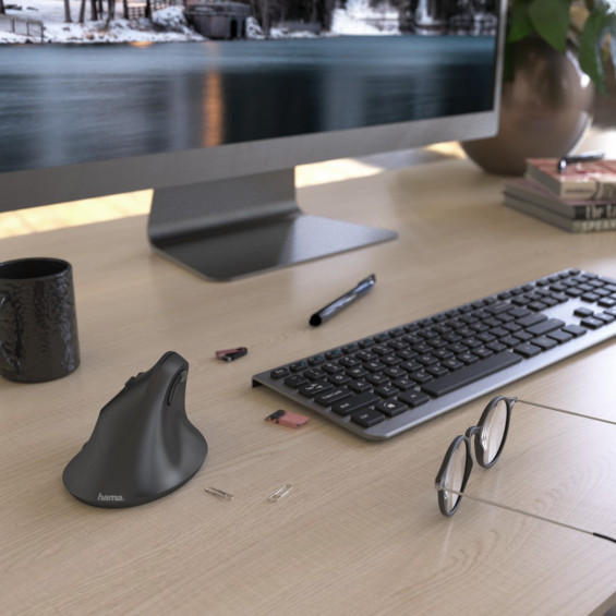 Hama | Ratón inalámbrico vertical ergonómico para zurdos "EMW-500L", 6 botones, negro, Izquierda, Diseño vertical, Óptico, RF inalámbrico, 1800 DPI, Negro