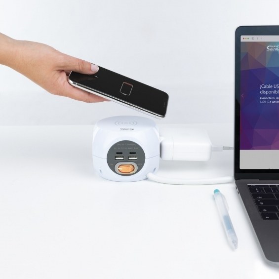 Nanocable Base de 3 enchufes con 4 USB's (2 USB A + 2 USB-C) y carga inalámbrica, con interruptor, Interior, Corriente alterna, Cargador inalámbrico, 1,4 m, Blanco