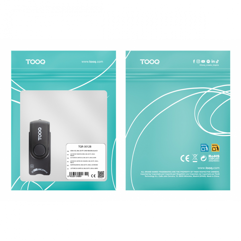 TooQ Lector Tarjetas Inteligentes, DNI Electrónico, SIM, SD, SF, USB-A, Negro, USB 2.0, Negro, 22 g